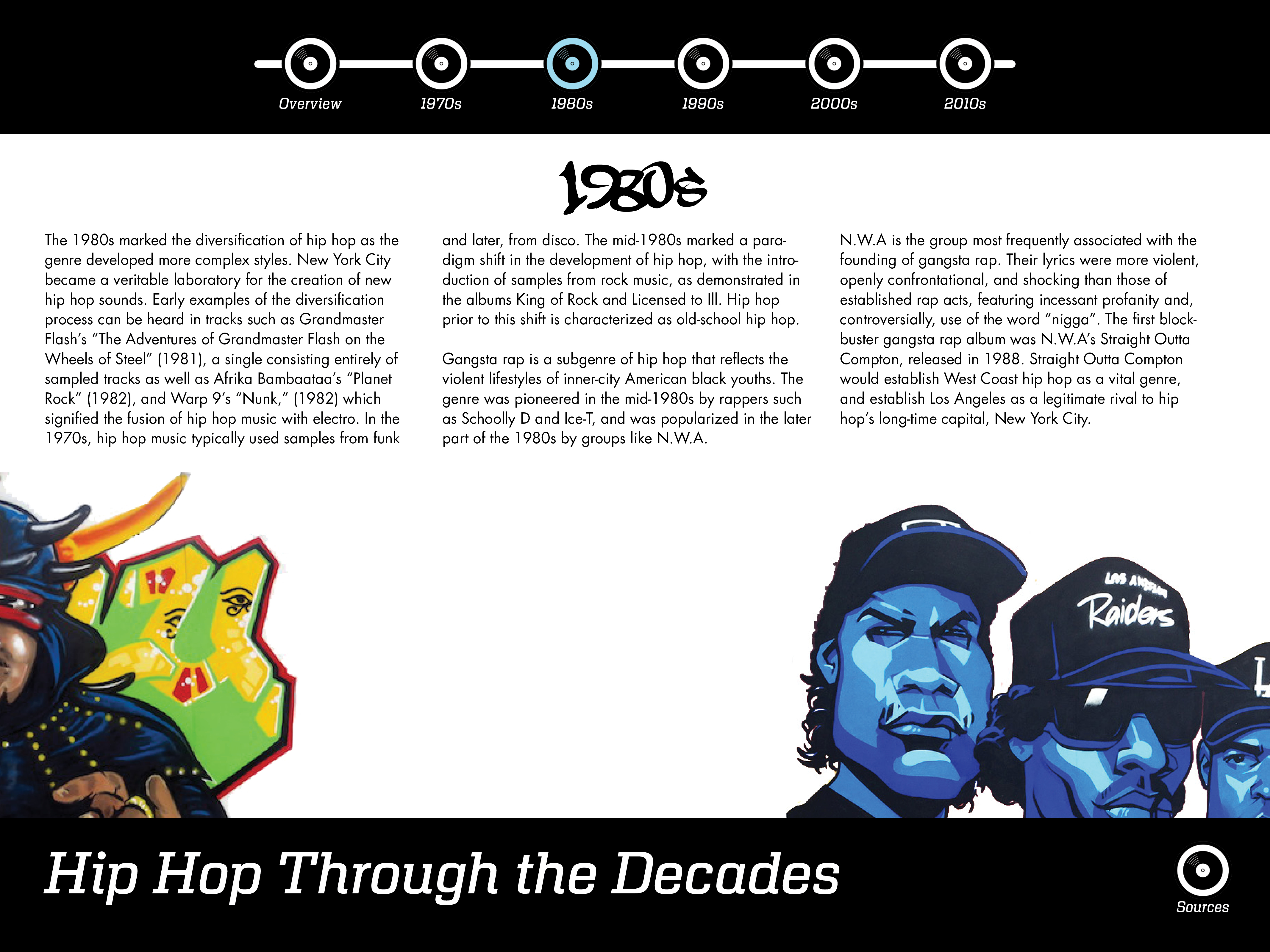 When clicking between different decades, the background image slides over as if it's just one continuous image that spans the artists of every decade. Right now the artists on the edge of the screen represent transitions from the past decade to the present one or vice versa. After making this mockup, I would consider having one or two artists in between them to include more visuals from each decade and to deal with the negative space that is currently serving no purpose.