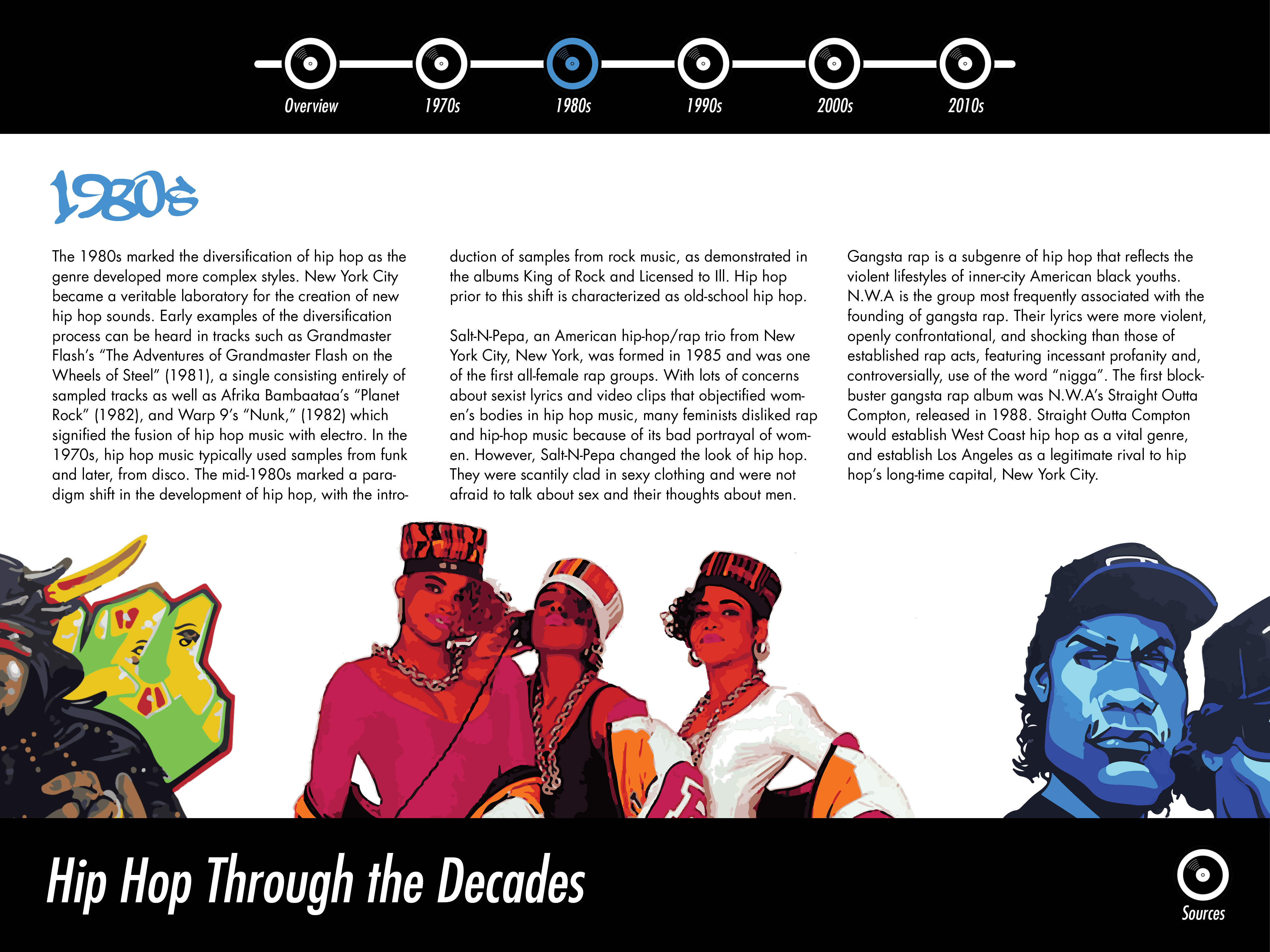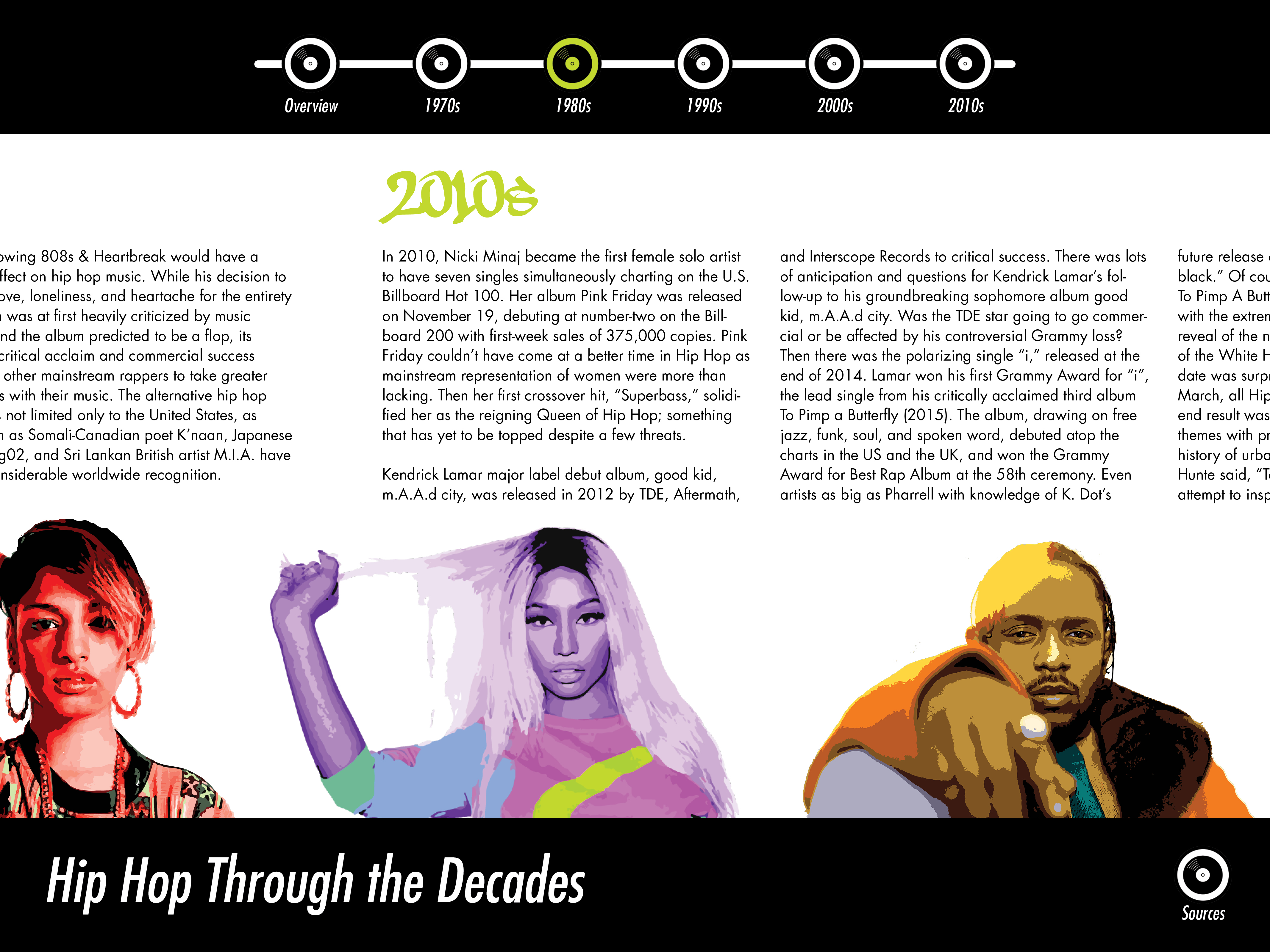 The earlier design had awkward spaces between the two artists on the edge of the page, whereas now the artists are lined up side-by-side to create a better balance of space. In the responsive design, some artists may disappear as the size of the window narrows. The color of the record player indicating the decade is more vibrant in this design than in the previous one. I also emphasized the inclusion of female artists when creating the content for the revised design.